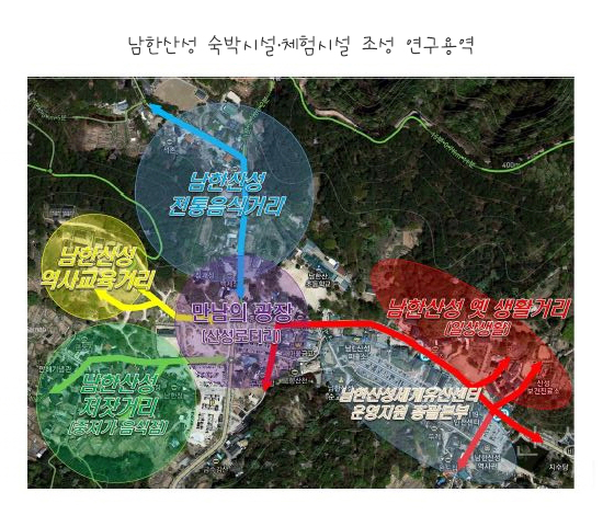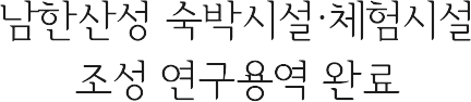 남한산성 관광관리 활성화를 위한 <남한산성 숙박시설‧체험시설 조성 연구용역>이 완료되었다. 올 해 7월부터 경기대학교 산업협력단과 진행한 이번 용역은 탐방객이 남한산성에서 체류하고 체험할 수 있는 방안으로 산성 내 숙박시설을 조성하고, 체험시설을 운영하는 것을 제시한 후, 이에 따른 본격적인 환경분석과 구체적인 조성방안을 연구하는 데 그 목적이 있다.