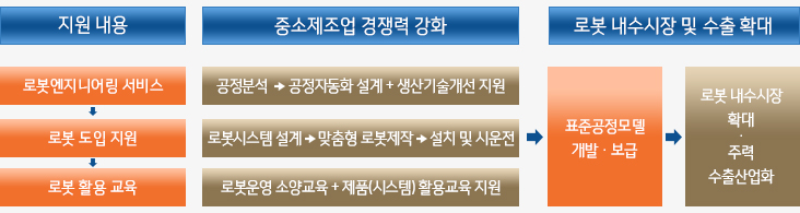 올해 정부는 로봇을 활용해 생산 공정의 혁신을 꾀하는 중소제조기업을 대상으로 로봇엔지니어링 컨설팅 서비스, 로봇 시스템 설치, 로봇 활용 교육 등 지원 사업을 펼친다. 이를 통해 중소제조업체들이 로봇을 적극 도입해 경쟁력을 높이고, 로봇산업의 내수시장 확대 및 수출 확대 기반을 마련토록 하겠다는 전략이다. 이 같은 계획은 ‘제조업 혁신 3.0’ 전략의 일환으로 추진되는 것이다.