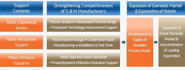 This year, the government will conduct a support project of a robot engineering consulting service, a robot system installation and a robot utilization education targeting small & medium manufacturers who will engage in the innovation of production process by utilizing robots. Through this, small & medium manufacturers have a strategy that will actively introduce robots to increase their competitiveness, and prepare a basis to expand domestic market and exportation. Such plan is a promotion as a part of the strategy 'Manufacturing Business Innovation 3.0'.