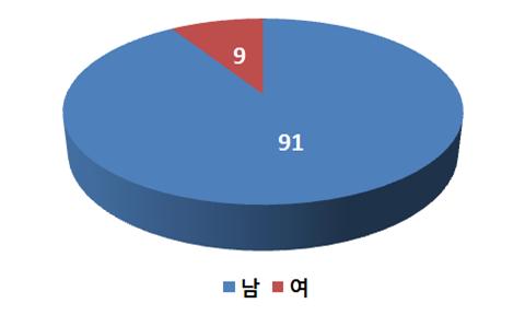 설문의 응답자 중 대부분(91%)은 남성으로 구성되어 있으며, 여성이 낮은 비율(9%)을 차지하고 있다.
