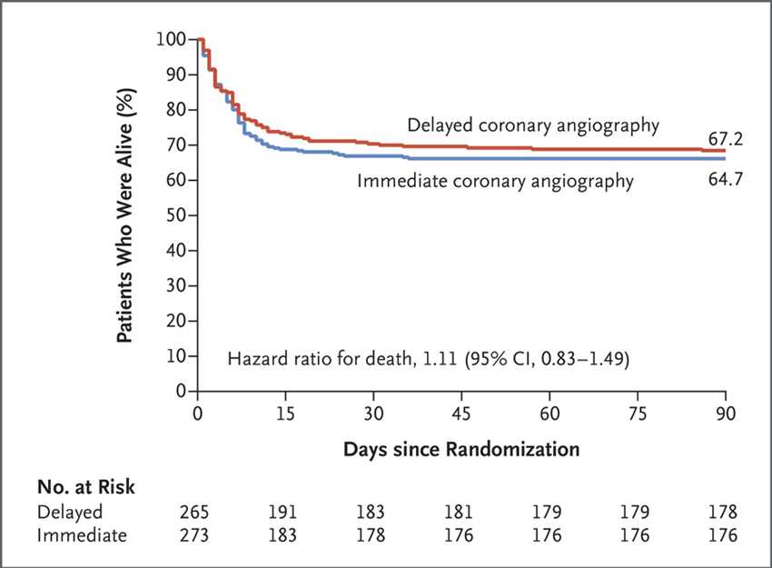 심정지에서 회복된 환자가 STEMI가 아닐 때, 응급 CAG는 지연(elective) 검사에 비해 생존에 더 유익하지 않았다.