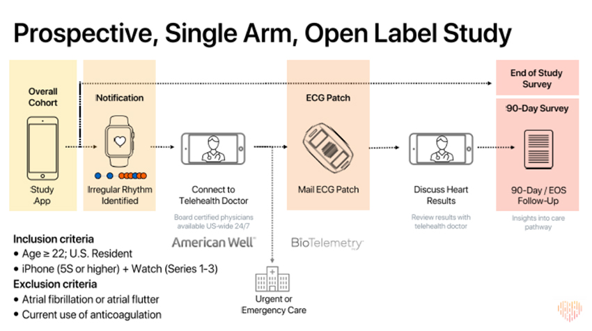 애플워치는 photoplethysmography를 사용하며 이는 혈류의 변화를 감지하여 맥박의 변화를 감지하는 방식으로 동작하는 방식이다. 애플워치 (시리즈1 이후 모델 OS4.0이상) 와 아이폰5S 이상과 연동하는 조건으로 연구자를 모집하였다. 참가자 419,093명, 22세 이상, 중재적 전향적 단일그룹 선별검사 연구로 진행되었다. 선별검사, 정보수집, 연구자 방문은 Video chatting을 통해서 진행하였고 애플워치에서 심방세동을 의심하는 신호가 발견되면 ECG patch로 심방세동 여부를 확인하는 방법으로 연구를 진행하였다. Primary Endpoints는65세 이상의 환자에서 8일간의 심전도 모니터링을 했을 때 30초 이상의 심방세동 발생율, 스마트워치 앱의 심방세동 진단율로 하였다.