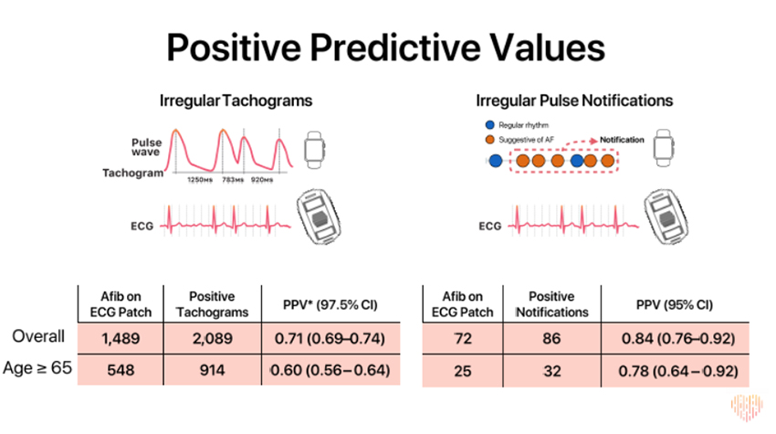 Primary endpoints: PPG 기반의 애플워치를 착용한 41만명 중 0.52% (450명)에서 불규칙한 맥박이 확인되었고 이들에게 ECG patch가 7일간 공급되고 이중 34%가 심방세동이 있는 것으로 확인되었으며 결론적으로 애플워치의 심방세동 진단 양성 예측도는 84%였다. Other Endpoints: 애플워치로부터 맥박 이상을 보고받은 사용자중 겨우 57%가 연구자와 접촉하였다. 시계의 불규칙한 맥박 보고는 65세 이상에서(3.2%) 그리고 남자에서(남:여, 0.7% vs 0.26%) 더 자주 있었다.