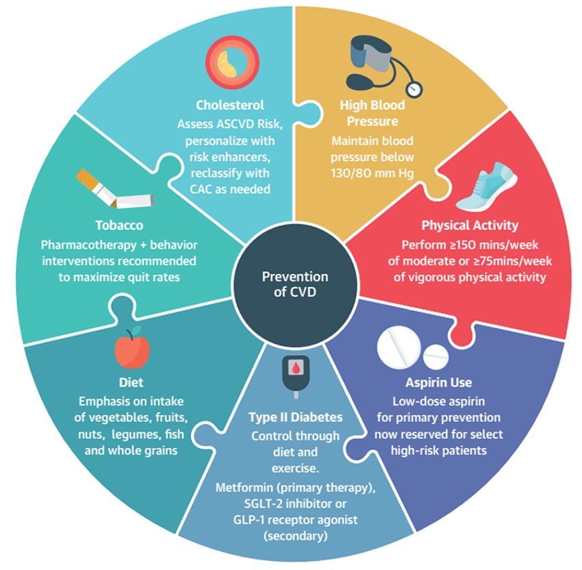 LDL 콜레스테롤 190 mg/dL 이상이거나, 40-75세 이상의 당뇨병, 위험도가 증가된 성인은 적즉적인 스타틴 치료가 필요하며, 이에 대해 의사와 상의하여야 한다. 고혈압은 2018년도 고혈압 가이드라인대로 <130/80mmHg를 목표로 치료되어야 한다고 재강조 한다.