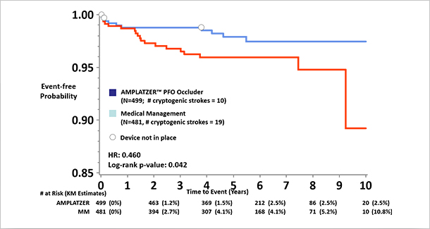 1980년대 이후 환자들의 대조 연구를 통하여 비교적 젊은 나이의 뇌경색 환자에게서 PFO의 빈도가 정상인에 비하여 높다는 것이 알려졌다. 더불어 원인 불명의 뇌경색과 PFO의 상관관계에 대한 임상적 연구 결과를 통해 PFO를 통한 우-좌 단락(Right to left shunt)에 의한 뇌경색을 포함한 전신 색전을 통한 기전을 입증되었다. 이를 바탕으로 1992년 이후로 PFO closure가 시행된 이후로 적절한 적응증 및 시술의 필요 여부에 대한 논란은 현재까지 이어지고 있지만, 몇몇 연구들은 메타분석을 통하여 약물치료보다는 기구를 사용한 치료가 더 효과적이라는 임상 결과를 보여 주었다. 불행히도 미국 유럽에서 시행한 3개의 대규모 전향적인 무작위 연구에서는 PFO closure 의 약물 치료 대비 뇌경색 예방에 유의한 감소 효과를 보여 주지 못했지만 시술 기구의 문제와 실제 시술 여부를 가지고 분석해 보면 적절한 기구로 시술이 적절하게 이루어진 경우는 유의한 뇌경색 감소 효과를 보여 줌을 보고하였다. 더불어 최근 RESPECT 장기 추적 관찰 결과에서 보면 원인 불명 뇌경색 예방 효과는 보다 명확하다는 것을 입증하였다.
