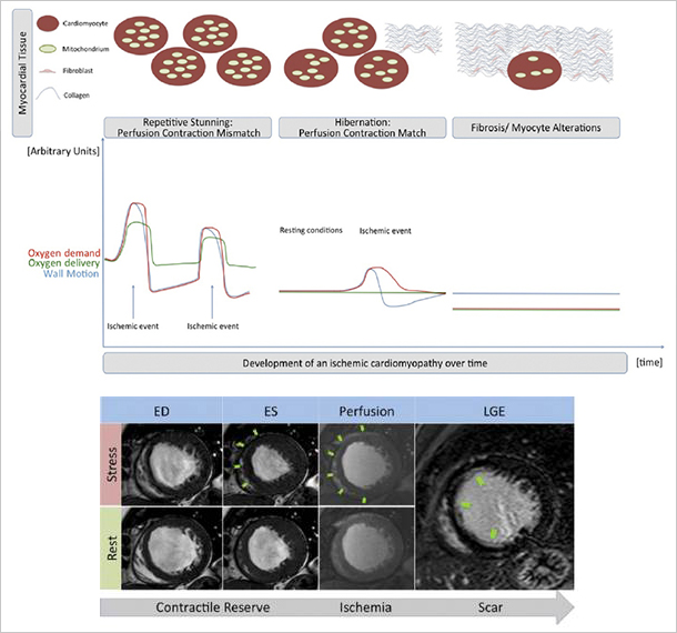 최근의 여러 발달된 치료와 시도들에도 불구하고, 허혈성 심근병증(ICM)은 여전히 높은 사망률을 보이는 질환이며 최적의 치료방법은 아직 결론이 나지 않았다. 병리학적으로 볼 때 ICM은 동면심근 (hibernating myocardium)부터 비가역적 반흔(scar)까지 다양한 기전으로 발생하는 심근기능부전이다. STICH trial은 1,212명의 ICM 환자에서 집중적인 약물치료 시와 약물치료와 관상동맥 우회술을 병행했을 시 주요 심혈관 사건을 비교하였다. 결과적으로, 양 군에서 사망률의 차이는 보이지 않았다. 그러나 이는 여러 단계의 병인에 의한 ICM을 같은 방법으로 치료한 데서 오는 포괄된 결과이므로 모든 환자에서 이 연구의 결과에 따라 치료하는 것은 부적절하다는 의견이 대두되었다. 즉, ICM의 원인이 되는 병인의 단계를 알 수 있다면 이에 따라 재관류술이 도움이 될 수 있는 군을 선별할 수 있다는 것이다. Hibernation 단계의 심근이 보이는 경우 재관류술은 약물치료군과 비교하여 예후에 분명한 이득이 있다. 그러나 scar 단계의 심근이 대부분인 경우 재관류술은 예후 개선에 있어 도움이 되지 않는 경우가 많다. 따라서 ICM환자에서 다양한 영상학적 검사로 Hibernation, Ischemia 또는 비가역적 scar 변화를 확인하고 이에 따라 치료 수준을 선택하는 것이 장기적인 예후를 고려하여 가장 적절하다고 생각된다. 양성자방출 전산화촬영(positron emission tomography; PET), 단일양자방출 전산화단층촬영(single-photon emission computed tomography; SPECT), 관류 심장 전산화 단층 촬영(Perfusion cardiac computed tomontraphy; Perfusion CT), 도부타민 부하심초음파(dobutamine stress echocardiography; DSE), 심장자기공명영상(cardiac magnetic resonance imaging; CMR)등이 이러한 ICM의 병리학적 상태를 영상학적으로 확인할 수 있는 검사방법들이다. SPECT, PET, DSE를 이용한 hibernating myocardium의 감별은 비교적 오래 전부터 연구되어오고 있으며 이러한 검사상 hibernation이 증명된 경우 재관류술을 통한 유의한 사망률 감소가 알려져 있다. PET의 경우 타 검사와 비교하여 심근의 관류-대사의 정도를 정량화 할 수 있다는 장점이 있지만 국내 보험 제한 등으로 주로 연구 목적으로 인용된다. SPECT는 과거 비침습적 관류, hibernation 평가에 중심적인 역할을 해왔으나 최근에는 radiation exposure 및 낮은 공간 해상도(spatial resolution)로 그 이용이 감소하고 있는 추세이다. 심초음파는 빠르고 간편하게 시행할 수 있어 가장 광범위하게 이용되고 있는 검사이며 저용량 도부타민 부하를 통한 hibernation의 평가 및 고용량 도부타민 투여시 허혈(inducible ischemia) 여부를 확인할 수 있다. 또한 심근 내 조영제 투여를 통해(myocardial contrast echocardiography; MCE) 심근 혈류량의 정량화가 가능하다. 그러나 음향창(acoustic window)가 좋지 않거나 심내막의 경계가 불분명한 경우에는 평가에 제한이 있다. CMR은 정확하고 통합적인 심근 상태의 평가가 가능한 검사방법으로 그 이용이 늘고 있다. 가장 정확하게 심실 내 용적 및 심장 수축 기능을 측정할 수 있으며 방사선 노출 없이 허혈 및 contractile reserve의 확인이 가능하다. 특히, 가돌리늄 지연 조영 영상(Late gadolinium enhancement; LGE)를 통해 심근 내 비가역적 반흔 여부를 직접적으로 보여줄 수 있어 ICM의 평가에 유용하다. 심근 수축저하를 보이는 심근이 LGE에서 반흔 없이 관찰되는 경우 hibernation을 진단할 수 있을 뿐 아니라 반흔의 심근벽 침범 정도(scar transmurality)가 재관류술 후 심근 기능 회복과 밀접한 관련을 가지고 있으며 심근두께의 75%이상의 반흔이 있는 경우 재관류 이후에 회복될 가능성은 2% 미만이다. 최근에는 고해상도 3차원 LGE를 통한 반자동화 반흔 정량이 가능한 CMR이 도입되어 보다 정확한 측정과 치료 효과 예측이 용이해지고 있다. 심근 손상 단계를 평가하기 위한 다양한 비침습적 영상학적 검사들이 있으며 각 검사들의 장단점을 함께 고려하여 적절한 치료적 접근에 필요한 검사를 재관류술 전에 시행하는 것이 좋겠으며, 이를 위해서는 다양한 환자군에서 이러한 비침습적 영상 검사들을 적용하는 적응증에 대해서는 보다 잘 디자인된 전향적인 예후 예측 연구가 필요할 것이다.