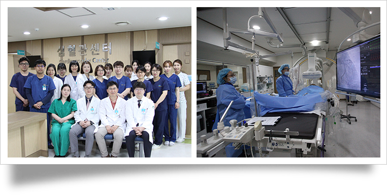 현재 4명의 심장내과 전문의와 20여명의 직원으로 구성된 심혈관 센터는 심장내과외래, 기능검사실, 심초음파 및 심혈관촬영실이 통합되어 있어 심혈관 조영술을 비롯한 모든 심장관련 검사가 당일 6시간의 입원으로 가능합니다. 특히 손목 요골동맥을 통한 시술이 활성화 되어있어 검사 후 협착이 심한 병변의 관상동맥 성형술 후 대부분의 환자가 다음날 바로 퇴원이 가능한 일박 이일 시스템을 구축하였습니다.