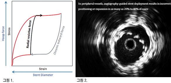 말초동맥질환에서 성공적인 경피적 경관 동맥성형술 (percutaneous transluminal angioplasty, PTA)이 시행되기 위해서는 혈관 직경, 병변의 석회화 및 플라크의 양상, 풍선 확장후 병변의 적절한 확장 여부 등이 적절히 평가되어야 한다. 이전 연구에 따르면 풍선 확장술에 있어 관강내 혈전 (luminal thrombus), 광범위한 박리 (extensive dissection), 과도한 크기의 풍선 확장 (oversized balloon dilatation) 등은 조기 재협착과 연관성이 높은 요소들이고, 30% 이상의 잔여 협착 (residual stenosis), 작은 크기의 풍선 확장 (undersized balloon use) 등은 후기 재협착과 연관성이 높은 것으로 알려져 있다. 말초혈관 질환에서 일차적으로 즉각적인 시술 성공이 가장 우선시 되어야 하지만, 현재까지 재발율이 높은 편이기 때문에 시술시 이에 대해서 신중히 고려할 필요가 있겠다. 주지하다시피 TASC C,D 대퇴동맥 병변에 대한 PTA시 금속 스텐트를 삽입할 경우 1년 재발율이 50% 이상 육박하기 때문에 이런 병변에 대한 시술시 약물 용출 풍선의 사용은 그 역할이 중요하다. 약물 용출 풍선을 사용함에 있어 가장 큰 제한점 중에 하나는 앞서 언급한 과도한 박리의 발생, 30% 이상의 잔여 협착과 같은 부적절한 풍선 반응이 발생했을 경우 인데, 이런 경우 재발율이 높기 때문에 이를 방지하기 위한 노력들이 필요하다. 부적절한 풍선 반응이 있는 병변의 경우에는 스텐트를 삽입해야 하는데, 현재 말초 동맥 질환에서 주로 사용되는 자가 팽창형 니티놀 스텐트를 대퇴동맥 병변에서 삽입했을 경우 재발의 기전으로 만성 외향력 (chronic outward force, COF, 그림 1)으로 인한 기계적 자극 (mechanical irritation)이 주요한 역할을 하는 것으로 알려져 있어 혈관 직경에 맞는 적절한 크기의 스텐트를 삽입하는 것은 재발율 측면에서 중요한 요소이다. 요약하면, 적절한 풍선과 스텐트 등 시술 기구의 크기를 선택하는 것은 재발율 측면에서 반드시 고려되어야 할 요소라고 할 수 있겠다. 이런 측면에서 말초 동맥 혈관 병변에 대한 중재술 동안 IVUS를 이용하여 정확히 혈관의 크기를 측정하여 풍선과 스텐트를 선택하는 것은 QCA 유도하에 혈관 크기를 측정하는 것보다 정확하기 때문에 재발율 측면에서 도움이 될 수 있다. 말초 동맥 병변에 스텐트를 삽입했을 경우 조영술 유도하 스텐트 삽입시 20-40% 가량 부적절한 스텐트 삽입이 이루어진다는 보고가 있는데, IVUS는 이런 부적절한 스텐트 삽입을 교정할 수 있는 유용한 도구로도 알려져 있다 (그림 2). 또한, IVUS는 혈관의 석회화 분포를 파악하는데 도움이 되어 심한 표재성 석회화가 동반되어 있다면 cutting balloon이나 atherectomy 같은 시술 기구를 일차적으로 선택할 수 있게 하는 유용한 정보를 제공한다.