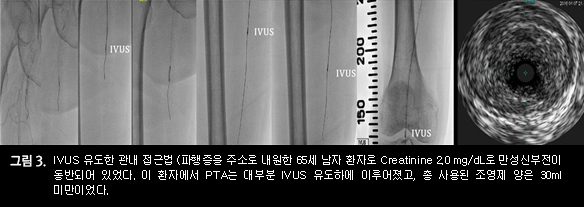 일반적으로 관내접근법 (intraluminal approach)은 내막하 접근법 (subintimal approach)에 비해 장기적 예후가 우월한지에 관한 임상연구가 부족하여 어느 기법이 더 좋은지에 관해서는 현재까지 정답은 없으나, 풍선 후 반응은 관내접근법이 더 좋은 것으로 알려져 있기 때문에 많은 시술자들이 이를 선호하는 편이다. IVUS는 관내 접근법 (Intraluminal approach)을 계획한 PTA시 가이드와이어 위치에 대한 정확한 정보를 제공할 수 있다. 또한, 신장 기능이 좋지 않는 신부전 환자에서 IVUS를 적극 활용하면 조영제 사용을 최소화 하는데 매우 유용할 수 있다 (그림 3). 이외에 기시부를 알 수 없는 완전 폐쇄 병변 (stumpless CTO)에서 기시 부위를 찾는데 IVUS는 결정적 역할을 제공하기도 한다 (그림 4).