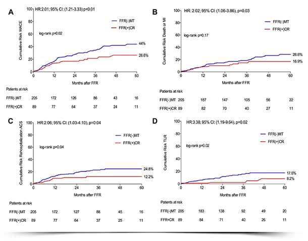 최근 Kennedy 등이 발표한 당뇨 환자를 대상으로 한 FFR-guided PCI 연구는 기존의 알려져 있는 사실에 배치되는 결과를 보여주었다. 이 연구는 후향적 연구로 294명의 당뇨환자를 대상으로 하였다. 한 개 이상의 FFR>0.8 이상인 중등도의 협착이 남아 있어 약물치료를 시행한 환자를 FFR (-) MT group 으로 하고 모든 병변이 FFR ≤0.8 로 완전 재관류를 시행한 환자를 FFR(+)CR 군으로 하여 임상경과를 추적 관찰하였다. 5년간 추적관찰 결과 FFR(-) MT 군에서 FFR(+) CR 에 비해 많은 MACE 가 발생한 것으로 보고 하였다 (44% vs. 28.6%, log-rank p=0.02). 심장사와 심근경색의 발생에서는 통계적으로 유의하지는 않았으나 28.6% 와 16.9%로 FFR(-) MT 군에서 높았으며, 급성 관상동맥 증후군으로 인한 입원율(24.8% vs. 12.2%, p=0.04) 과 병변 재 관류율(Target lesion revascularization, TLR, 17.8% vs. 8.2%, P=0.02) 도 유의하게 높았다. 본 연구는 후향적 연구이며 양 군에서 환자의 특성에 차이가 있고 치료 방법에 있어 FFR(+) CR 군이 관상동맥 우회수술 (Coronary artery bypass graft surgery, CABG)을 시행한 환자가 월등히 많았으며 당뇨의 유병기간이나 조절 정도에 대한 정보가 없어 제한점이 많은 연구이다. 그럼에도 불구하고 당뇨 환자에서의 FFR-guided PCI 의 안전성에 대해 이 연구 결과는 시사하는 바가 크다고 할 수 있겠다.