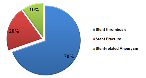 연구 분석 결과가 지난 2016년 01월 07일~09일 사이에 개최되었던 대한심혈관중재학회 동계통합학술대회에서 발표되었고, 결과를 간략히 요약하면 stent failure의 분포와 비율은 다음과 같았습니다.