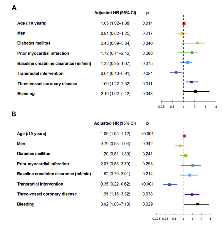 (그림) Independent predictors for MACE (A) and death (B), CI = confidence interval; HR = Hazard ratio.5)
