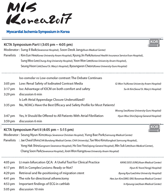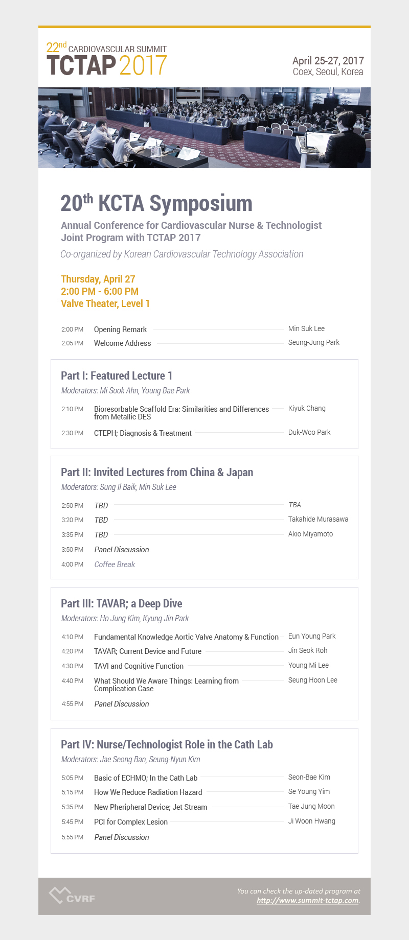 지난 1월 14일 제13회 동계통합학술대회 KCTA Symposium이 회원 여러분의 많은 참여와 격려로 잘 마무리 되었습니다. 또한 동계통합학술 대회에서 개최된 정기 KCTA대의원회의 에서는 제 8대 KCTA회장으로 서울아산병원의 이민석 전 KCTA 총무이사가 선출 되었습니다. 새로운 임원진과 더불어 회원 여러분에게 다양한 학술적인 정보를 제공할 수 있는 연구회가 될 것을 약속 드립니다. 3, 4월의 KCTA에서는 회원 여러분들의 좀더 다양한 학문적 욕구를 반영하여 학회를 준비했습니다. MIS- KOREA 와 TCTAP 학회를 통해 처음 Cath lab에 입문 하시는 분부터 현재 근무하고 계시는 선생님들께 다양한 컨텐츠가 제공될 예정입니다. 선생님들의 많은 관심 부탁 드립니다.