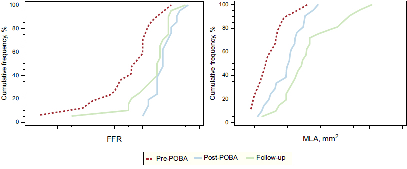 POBA 이전과 이후, PCB 치료 9개월 이후에서 최소 내강 면적의 변화는 각각 75.2% [37.2 – 164.7]와 50.0% [1.1 -64.5]로 증가하였다. 모든 환자에서 시술 이후 시행한 OCT 상 내막 박리가 발견되었으나 9개월 이후 시행한 OCT 상에서 내막 박리 중 66.6%가 치유됨을 확인하였다. 표적 병변에서의 FFR 값은 POBA 이전에는 0.71 ± 0.14, POBA 이후에 0.87 ± 0.04, PCB 치료 9개월 이후에는 0.83 ± 0.08 였다.