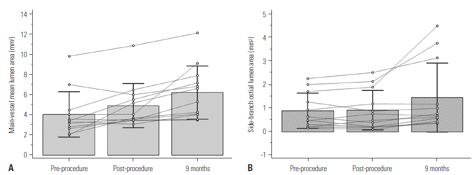 SB 입구의 내강 면적이 각각 시술 이전에는 0.92 ± 0.68 mm2, 시술 이후에 1.03 ± 0.77 mm2, 9개월 이후에는 1.42 ± 1.18 mm2 였다. SB 입구 내강 면적의 증가율은 각각 시술 이전과 이후에서 3.9% [-33.3 – 10.4], 시술 이후와 9개월 이후에서 52.1% [-0.7 – 77.3], 시술 이전과 9개월 이후에서 76.1% [18.2 – 86.6]였다.