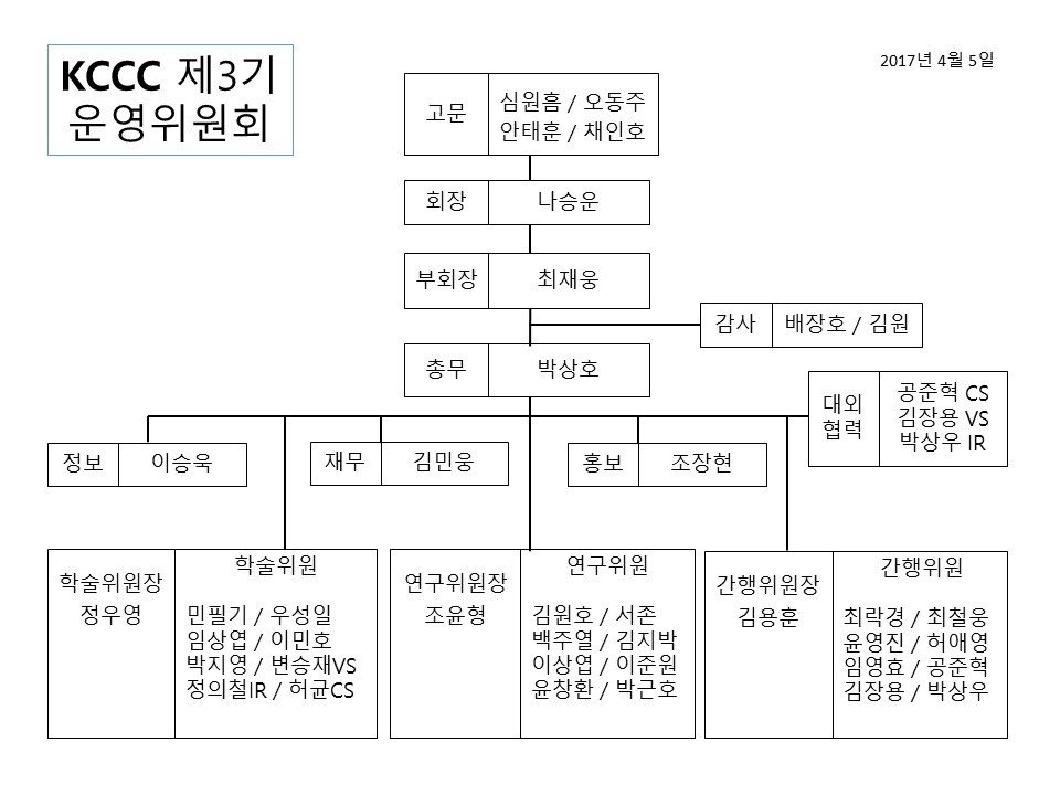 1. 2017년 4월5일 제 13차 K-CCC 학술 행사가 서울 역사 회의실에서 성황리에 진행되었고, 이 자리에서 제 3기 신임 회장으로 고려대학교 구로병원 나승운 교수님이 선출되었다. 이후 3기 운영위원회 새로이 조직되었는데 아래와 같다.