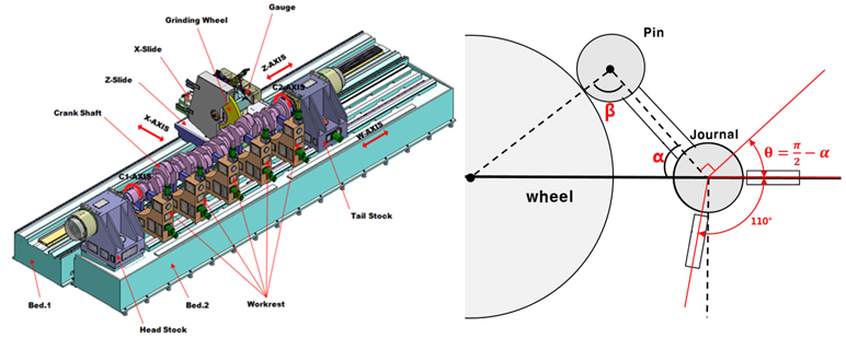 - 크랭크샤프트와 방진구의 강성, 가공 지점간의 관계를 식으로 표현하고 식을 토대로 발생 오차를 예측하고 방진구의 위치 조절로 오차를 보정함
