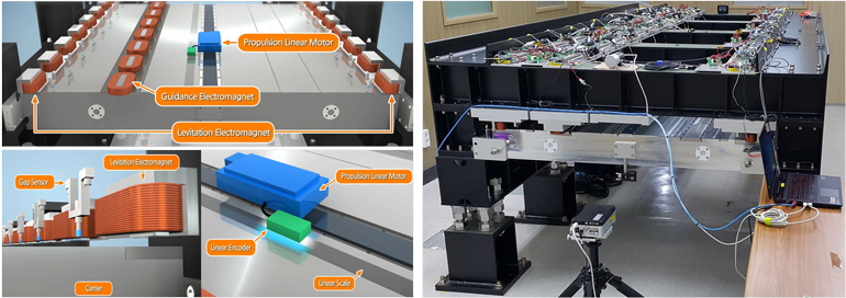 - 동력원이 없는 캐리어를 지면 프레임에 부착된 전자석과 센서를 이용하여 공중에 띄워 이동하는 기술로 진공 적용이 가능한 것이 장점