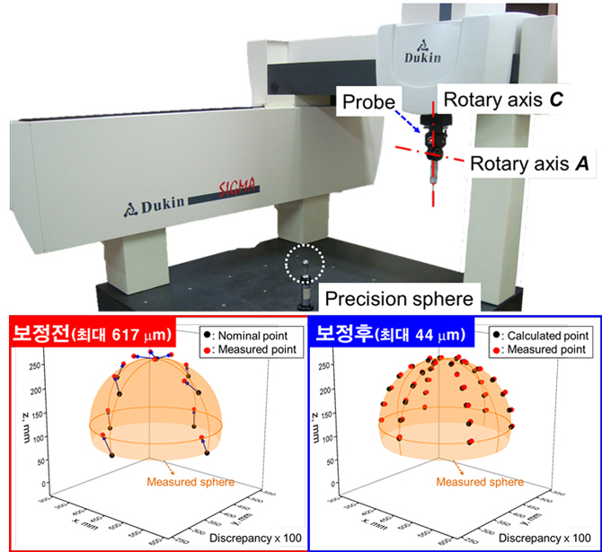 양승한 교수(경북대) 연구팀은 대표적 핵심 생산시스템인 5축 공작기계와 3차원 좌표측정기의 주요 기하학적 오차를 최적측정/제어하는 실용적 방법을 개발하였다.