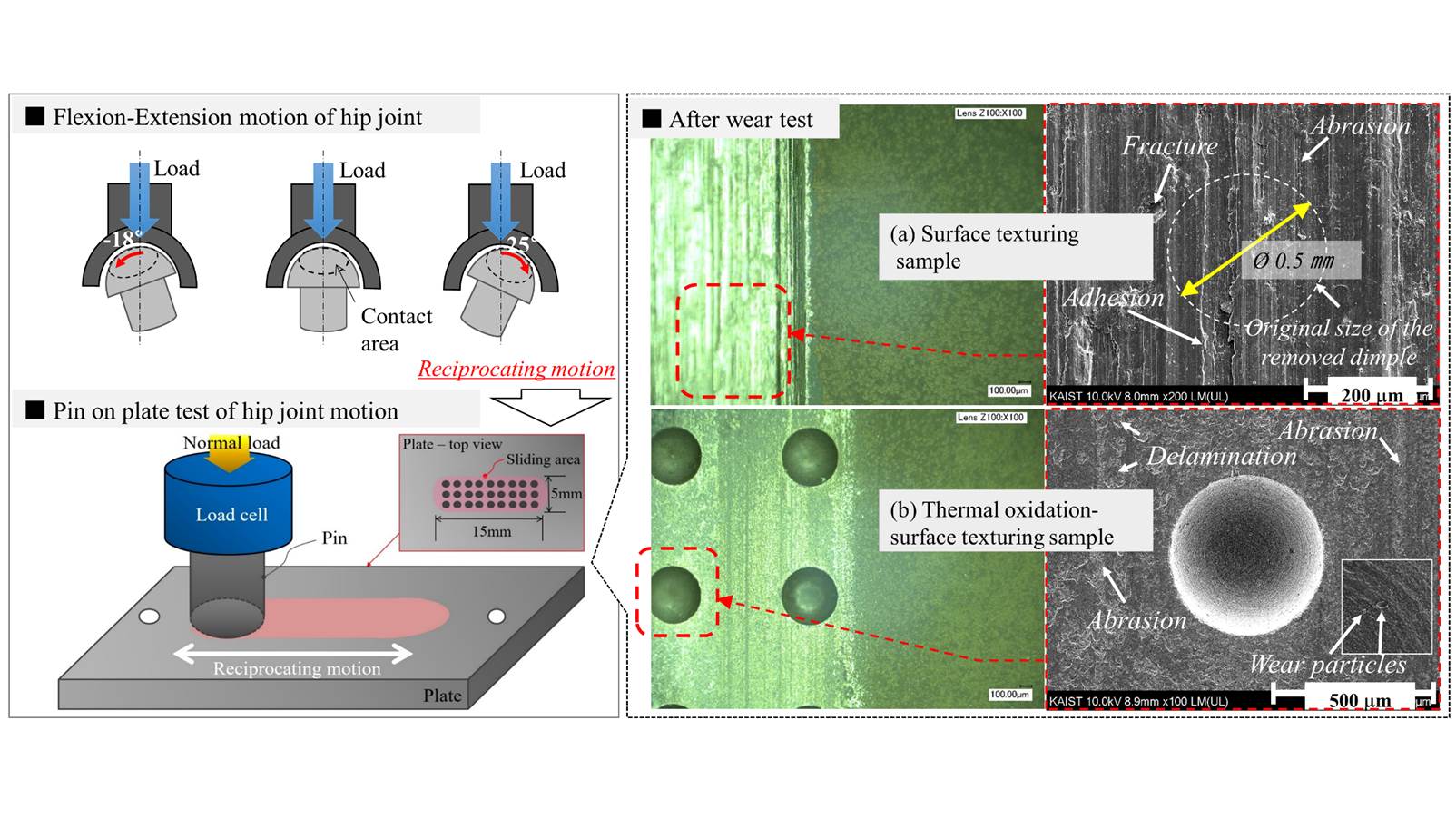 - 결과적으로, 적용된 마모 환경 하에서 열 산화-표면 텍스처링(딤플 가공) 된 티타늄 합금 대 표면 개질 되지 않은 티타늄 합금의 마찰 쌍 조합이 MOM 베어링에 가장 적합함을 확인 하였다.