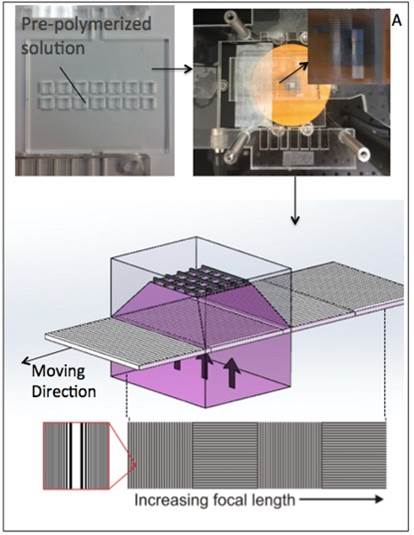 연구팀은 기존의 photo-patterning 2차원 적층 기반 하이드로젤 tissue scaffold 제조 방식을 발전시켜, 두개의 다른 파장을 가진 LED 광원이 각각 photo-initiator 와 photo-inhibitor로 동시에 하이드로젤 TEGDMA에 주사됨으로서, 수초의 짧은 시간에 3차원 하이드로젤 구조 생성을 가능하게 하는 기술을 개발하였다.