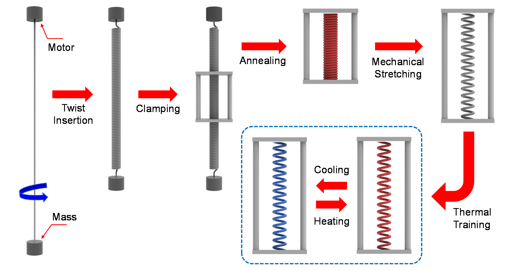 - 나일론 소재 섬유 기반의 트위스트 삽입형 코일 구조 액추에이터는 특정 열처리 과정을 통해 수축, 이완이 가능한 열-구동 인공근육으로 활용할 수 있는데, 연구팀은 수축 공간을 확보하기 위한 열처리 과정에서 코일의 피치를 조절함에 따라 최대 수축률을 증가시킬 수 있음을 밝혀냈다.