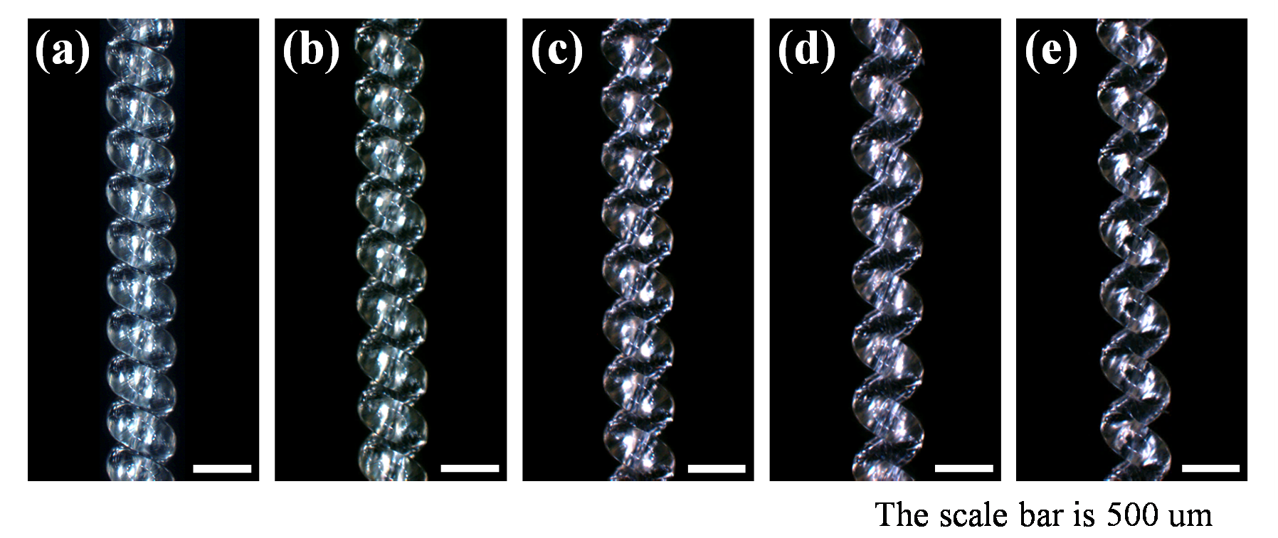 [그림설명] 피치 제어형 코일 구조 액추에이터 제작 과정과 서로 다른 피치의 인공근육섬유: (a) 0%, (b) 10%, (c) 30%, (d) 50%, (e) 70%