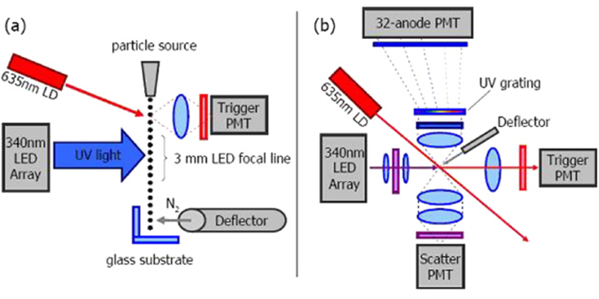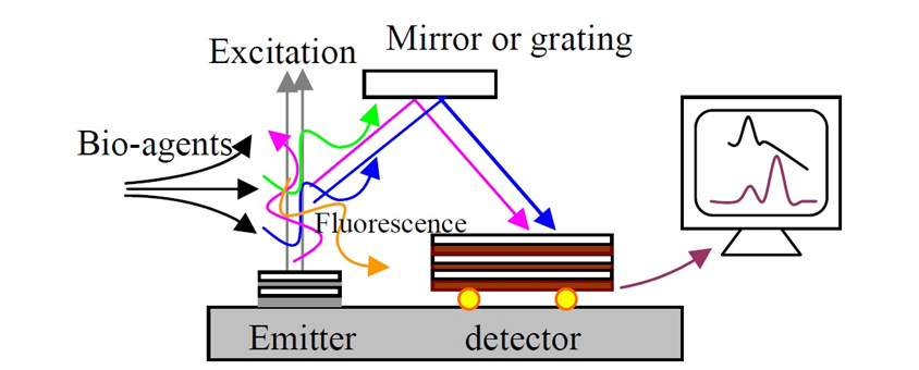 [그림 설명] Fig. (top) UV in the Electromagnetic Spectrum; (middle) UV micro-LED arrays for biological imaging and detection (Xu et al., 2008); (bottom) a biological agent sensing system based on UV emitter and detector (Wang et al., 2009)