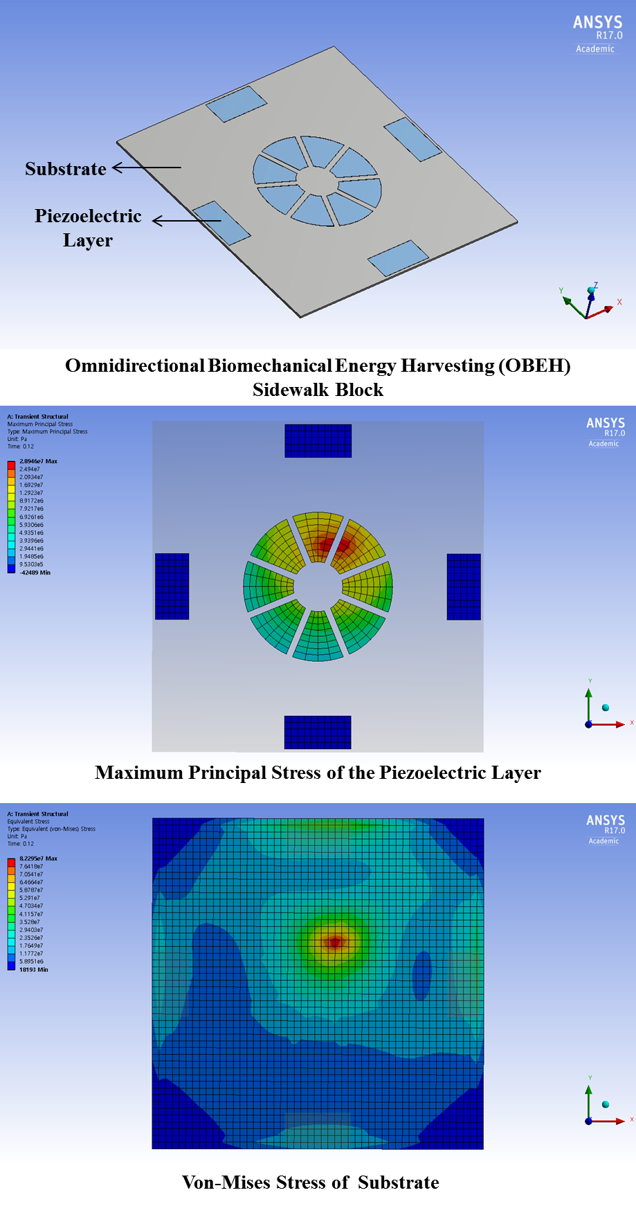 본 연구팀은 실제 발걸음 위치와 방향이 일정하지 않다는 점에 착안하여 전방향(Omnidirectional) 전력 수확 메커니즘을 최초로 도입했으며, 생체역학적으로 분석된 보행 하중 프로파일에 대하여 압전 에너지 수확 보도블록이 변환할 수 있는 전압을 사전에 예측할 수 있는 다중 물리(전기-탄성 연성; Electroelastic Coupling) 유한요소해석 모델을 개발하였다.