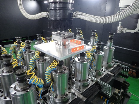 • 면적 5m x 3m, 두께 1mm급 곡면소재 고정을 위해 높이 16.5mm 이동가능한 28개 축으로 구성된 유연지그시스템 개발