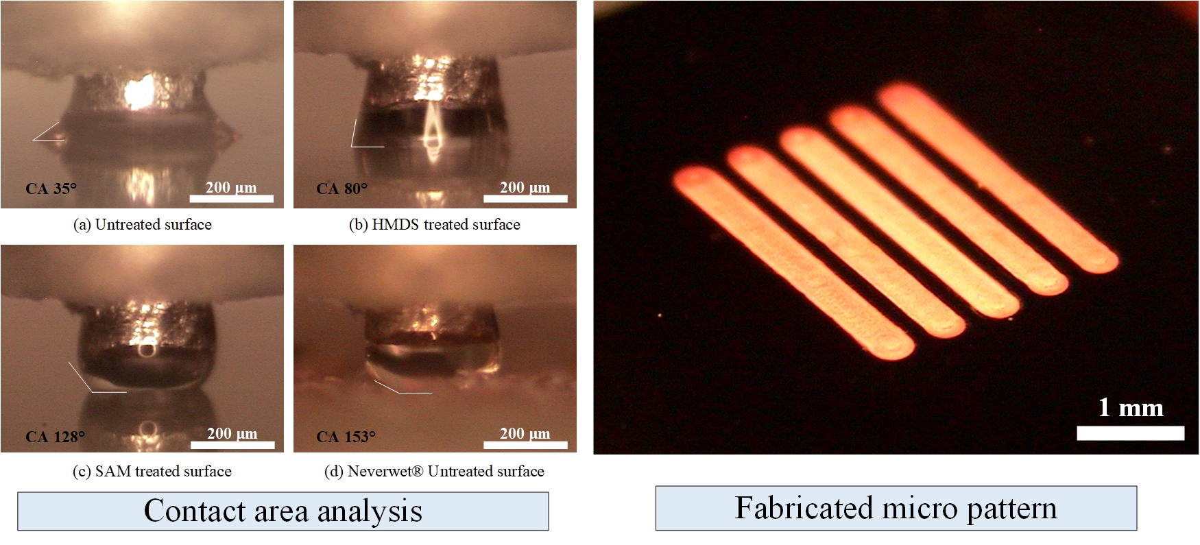 전해액의 접촉면적에 영향을 주는 공정 인자를 분석하고 소수성 표면처리 기술을 적용하여 미세 금속 패턴 제작