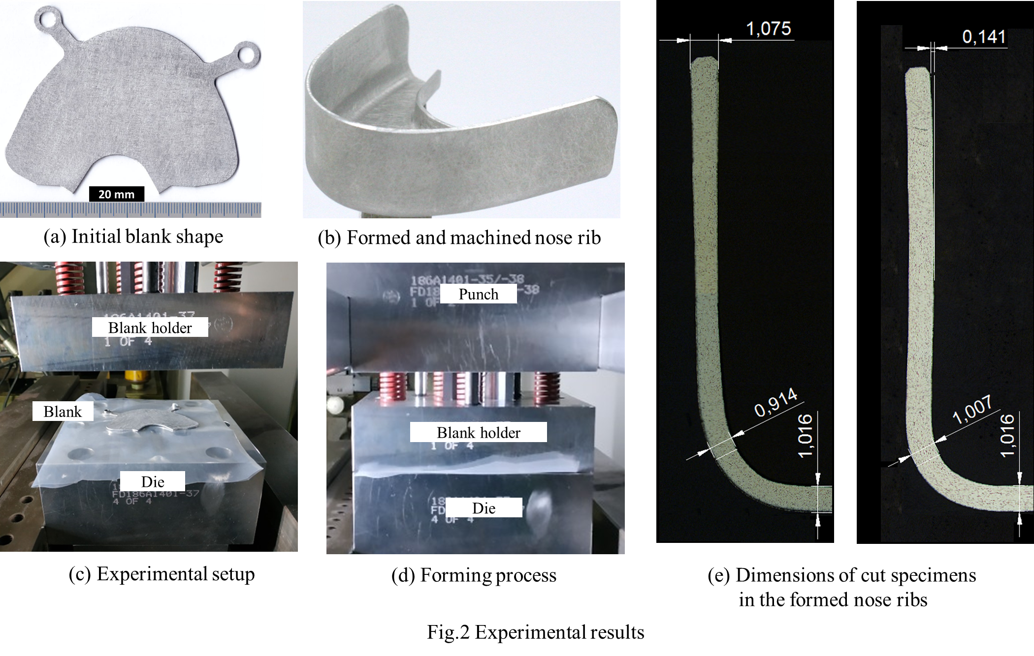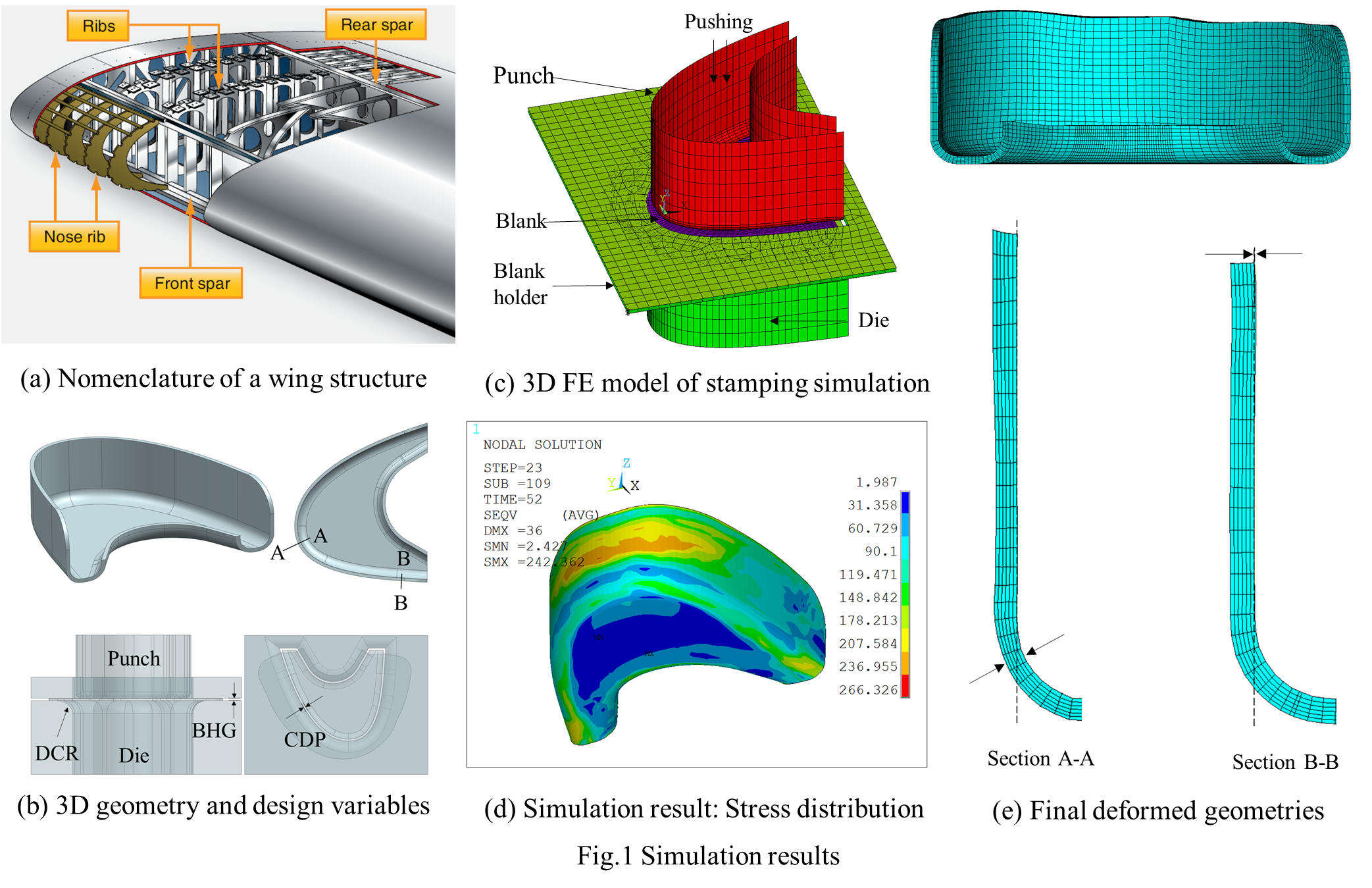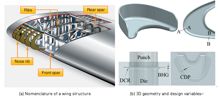 항공기 날개에 사용되는 리브는 다양한 곡면 형상을 가지고 있으며, 스탬핑 성형 동안 얇은 블랭크는 압축과 인장 등 다양한 하중에 의해 주름 발생, 국부적인 두께 변화, 파손 및 성형 후 스프링백 등의 결함을 유발할 수 있으므로, 정밀성형을 위한 최적의 성형공정에 대한 연구는 수행되었다.