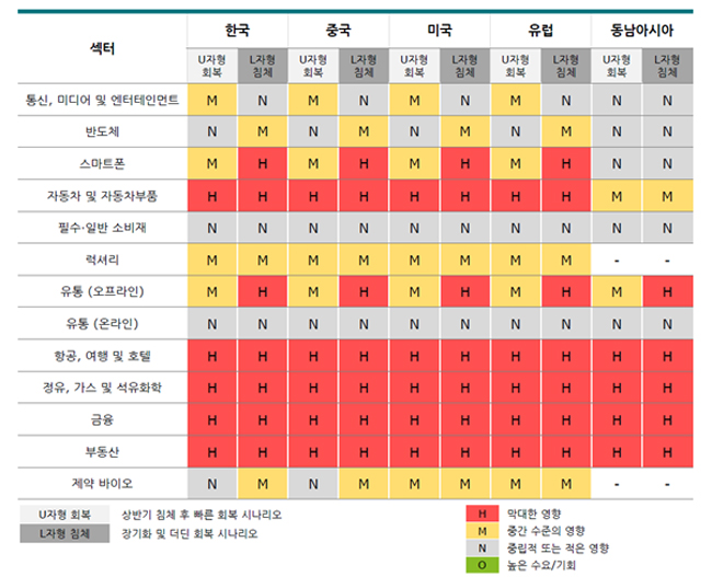 산업별/지역별 영향 필자가 근무하고 있는 딜로이트에서 발표한 “COVID-19의 산업별/지역별 영향분석 보고서”에서는 COVID-19 상황에 대해 U자형 회복시나리오 및 L자형 침체시나리오를 가정한 뒤 각각의 시나리오에 대한 지역별·산업별 영향을 아래와 같이 분석 하였다.