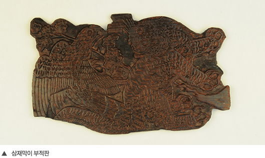 12월의 유물로 선정한 이 부적판은 매와 호랑이가 함께 조각되어 있어 삼재부적을 찍기 위해 만들었던 목판임을 알 수 있다. 삼재를 물리치는 대표적인 동물인 매와 함께 귀신을 제압하는 능력을 지닌 호랑이를 더한 것은 부적의 능력을 강화시키기 위한 조치로 풀이된다. 꼬리를 하늘로 치켜세우고 날카로운 이빨을 드러내며 으르렁거리는 호랑이와 날개를 퍼덕거리면서 날카로운 부리와 발톱으로 당장이라도 공격할 자세를 취하고 있는 매는 어떤 재앙이 밀려와도 막아낼 수 있는 듯 당당한 모습으로 표현되었다.