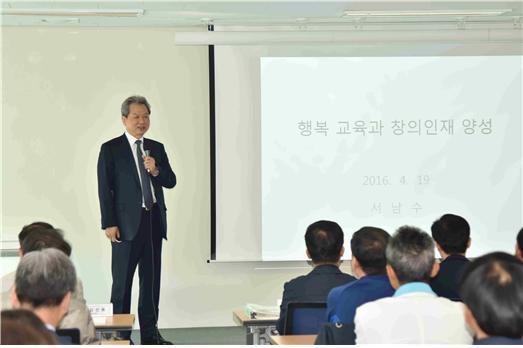 중앙교육연수원(원장 정일용)은 지방교육자치 행정의 질을 향상 시키고자 시·도교육청 4급 공무원을 대상으로 4월 19일(화) 10시부터 서남수 前 교육부장관을 초청하여 “행복교육과 창의인재양성”이라는 주제로 특강을 실시하였다. 서남수 前 교육부장관은 주요 교육정책을 기획·집행했던 30여년간의 풍부한 행정경험을 토대로 “학생의 꿈과 끼를 살리는 교육, 창조경제를 견인할 인재육성”등에 관한 내용으로 강의를 하였다.