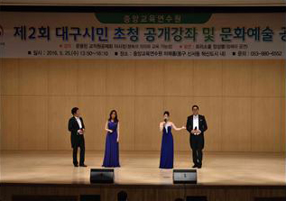 | ■ | 중앙교육연수원(원장 정일용)은 5월 25일 대구시민을 초청하여 공개강좌를 개최하였다. 문용린 교직원공제회 이사장(前 교육부 장관)의 ‘행복의 의미와 역량, 그리고 교육’이라는 주제 강연과 대구지역 문화단체인 프리소울 앙상블의 팝페라 공연이 있었다 |