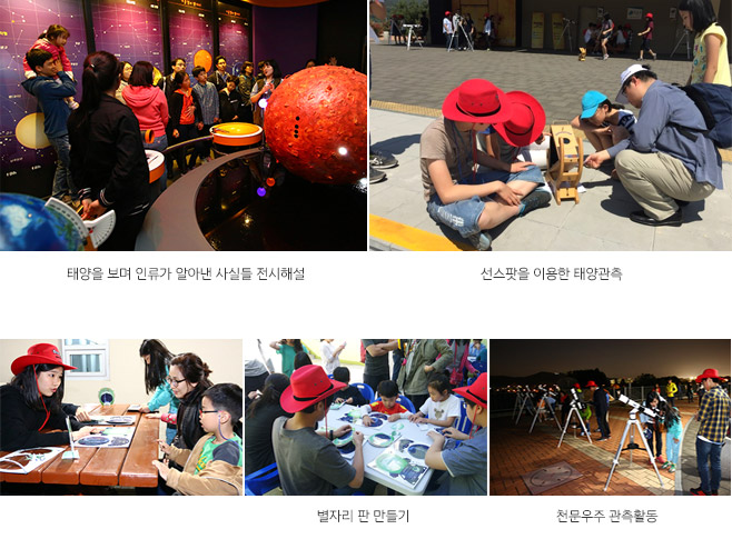 과학에 대한 열정과 자신감 넘치는 천문우주 서포터즈 3기 학생들이 드디어 활동을 시작합니다. 5월 7일부터 매주 주말, 오후 1시에서 5시까지, 빨간 모자를 쓴 친구들과 함께 우주를 탐구해보는 즐거운 여행을 떠나보세요. 스페이스월드 전시장과 천체관측소 입구에선 해시계 만들기, 별자리 판 만들기 등 천문우주관련 공작 체험 존이 운영되며 전시물 해설, 관측활동 등 다양한 프로그램이 마련됩니다. 언니, 오빠, 혹은 친구에게 배우는 천문우주이야기로 더욱 색다른 경험이 될 거에요. 앞으로 펼쳐질 재기발랄한 천문우주 서포터즈의 다양한 활동을 함께 지켜봐 주세요.
