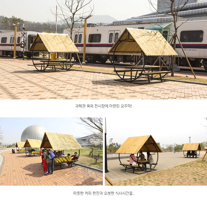 따듯한 날씨에 실내보다는 야외 공간에서 활동하기 좋죠. 싱그러운 봄을 만끽하고 싶다면 과천과학관 야외공간에 마련된 그늘막 아래서 맑은 풍경을 바라보며 휴식을 취해 보세요. 지난 4월 설치된 야외오두막은 실내 전시관람 후 잠깐의 휴식과 함께 기분 전환할 수 있는 장소로 더할 나위 없어요.