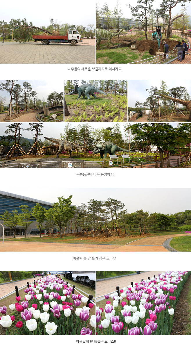 봄과 여름, 푸르른 나무를 보고 있으면 괜스레 기분이 좋아지죠. 따듯한 봄, 과천과학관 옥외전시장에도 싱그러운 녹색기운과 활력이 더해집니다. 4월의 식목일과, 5월 신록의 달을 맞이하여 과천과학관은 여러분들의 쾌적한 관람환경을 위해 옥외전시장, 역사의 광장 주변 수목을 정리하고 아늑한 녹지대를 만들고자 어울림 홀 전면에 소나무 숲을 조성했어요. 또한 공룡동산에서도 마치 공룡이 살고 있었던 시대로 여행을 하는 것과 같이 더욱 울창해진 모습을 만나볼 수 있답니다.
