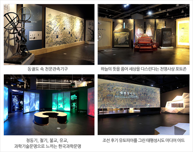 전시장 입구에 들어서면 한 조선 화가가 꿈꾼 유토피아를 대형 미디어아트로 관람해 보고, 어좌 좌우에 배치된 별자리와 세계지도 앞에서 멋진 사진을 찍어 볼 수 있어요. 더불어 조선의 CSI 검시제도, 맥진기, 1:1 크기로 설치된 신대동여지도를 통해 한반도의 산과 바다, 특산물을 찾아 여행을 떠나 볼 수 있어요. 또한 전통 목공예, 천연염색, 한지, 금속, 도자기의 특징과 현대 과학기술을 응용한 전시물이 있으며, 육지와 바다에서 나라를 지키기 위한 무기기술과 알아보고 마지막으로는 청동기-철기-불교-유교-과학기술 시대를 대표하는 이미지와 소리를 감상하며 한국과학문명의 특징인 창의성, 세계성, 역사성을 느껴볼 수 있답니다.