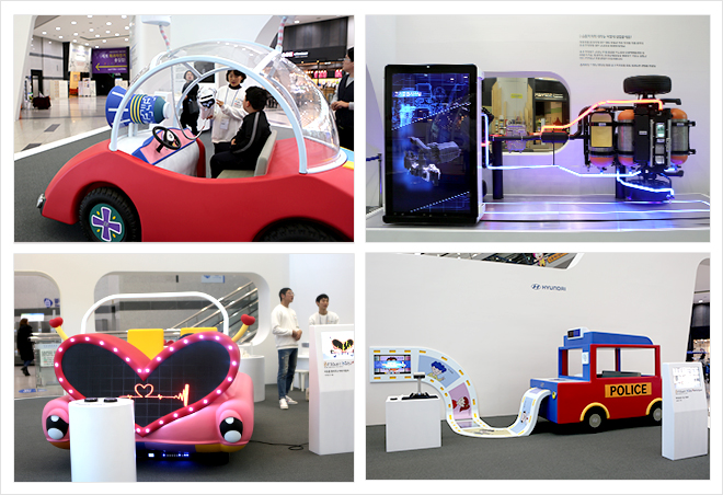 미래의 꿈나무, 어린이들의 무한한 상상력과 창의력으로 그려진 7점의 키즈 모터쇼 수상작품이 직접 타볼 수 있는 실물 모형자동차로 제작되어 우리 관에 전시됩니다. 어린이의 창작 스토리가 담겨있는 7대의 미래 상상자동차는 시각장애인도 운전할 수 있도록 특수 안경과 카메라를 장착한 ‘시각장애인의 눈이 되어 주는 자동차’, 야간 순찰 중 범죄자의 얼굴과 위치정보를 인식해 쉽고 빠르게 범인을 체포할 수 있는 ‘범인을 알고 있는 자동차’, 자동차를 타고 다양한 풍경을 볼 수 있도록 360도 회전하며 이동하는 ‘360도 회전자동차’, 여러 가족이 함께 여행을 즐길 수 있도록 합체와 분리가 자유로운 이동형 가정집 ‘H&H CAR’, 차에서 나눈 대화를 기억해 기분에 맞게 음악도 틀어주고 드라이브 코스도 정해주는 센스만점의 ‘마음을 알아주는 하트자동차’, 벌집모양의 자동차와 꿀벌 로봇들이 태양광을 모아 만든 에너지로 움직이는 친환경 ‘벌집 에너지 자동차’, 입 · 출국문과 지구본이 탑재되어 있고 이용료가 없어서 마음껏 세계여행을 할 수 있는 ‘WORLD TOUR CAR’ 등 어린이의 톡톡 튀는 상상력과 독창적인 이야기를 만나볼 수 있어요. 이외에도 본선에 입상한 150작품의 그림이 전시되고 친환경 수소전기자동차의 원리를 알아 볼 수 있는 알찬 코너도 준비되어 있으니, 미래 자동차에 대해 상상해보는 시간을 만들어보시기 바랍니다.