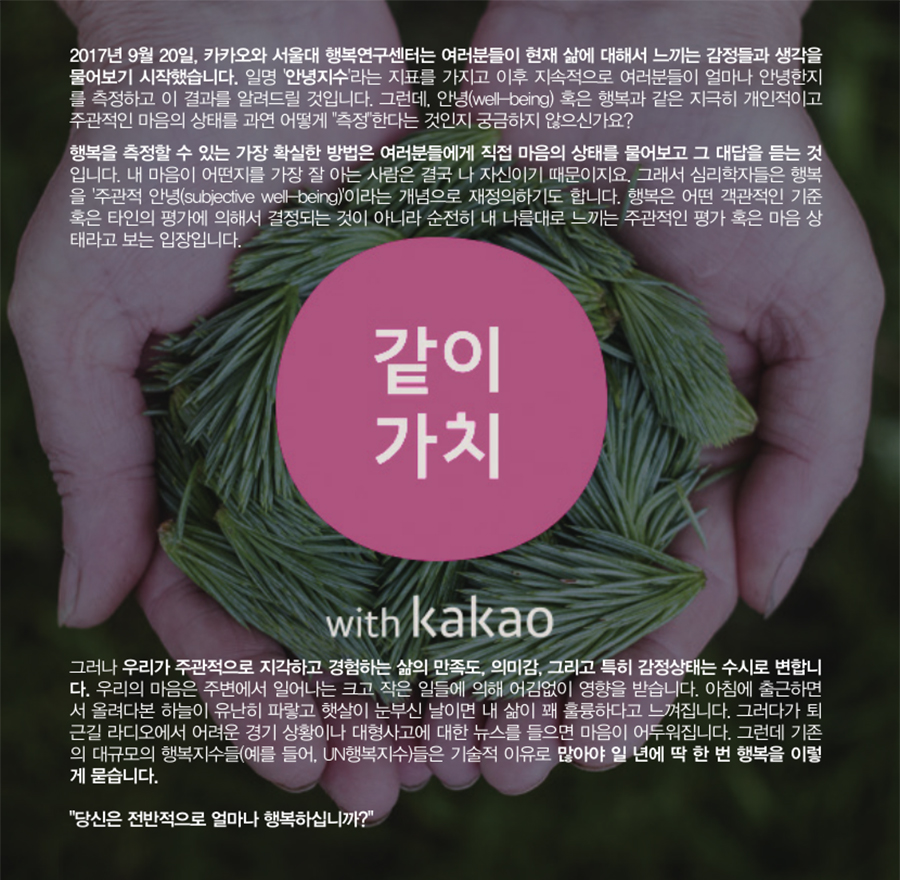 그래서 저희들은 사람들의 마음 상태를 실시간으로, 여러 번, 언제든 자유롭게 측정할 수 있도록 "안녕지수" 를 개발하였습니다. "안녕지수"는 기존의 대규모 행복지수들과 달리, 여러분이 일상에서 경험하는 행복감은 물론 여러분의 마음이 시간, 장소, 그리고 여러 상황에 따라 어떻게 바뀌는지 추적할 수 있습니다. "안녕지 수"는 기존 행복지수의 한계점을 보완하는 전혀 새로운 행복지수라 할 수 있습니다. 이 모든 것이 대한민국 대표 메신저인 카카오라는 플랫폼이 있기에 가능한 일이라 생각합니다.