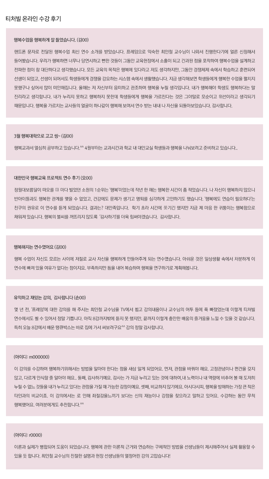 행복수업의 가장 중요한 이유인데요, 교사가 행복해야 학생이 행복합니다. 학생의 행복을 위해서 억지로 하는 수업이 아니라 선생님들의 행복을 위해서 자발적으로 하시는 연수가 될 수 있도록 충분한 이론적인 지식과 자세한 노하우들을 가르쳐 드리는 연수가 되도록 최선을 다해서 노력하겠습니다. 감사합니다.