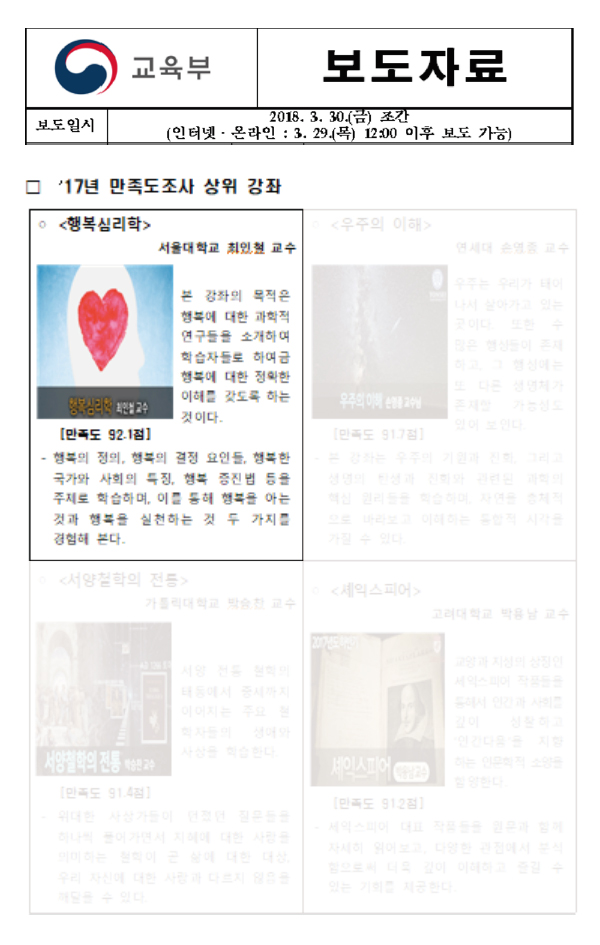 운영계획을 보도하면서,최인철 교수의 ‘행복심리학’(92.1점)등 4개강좌를