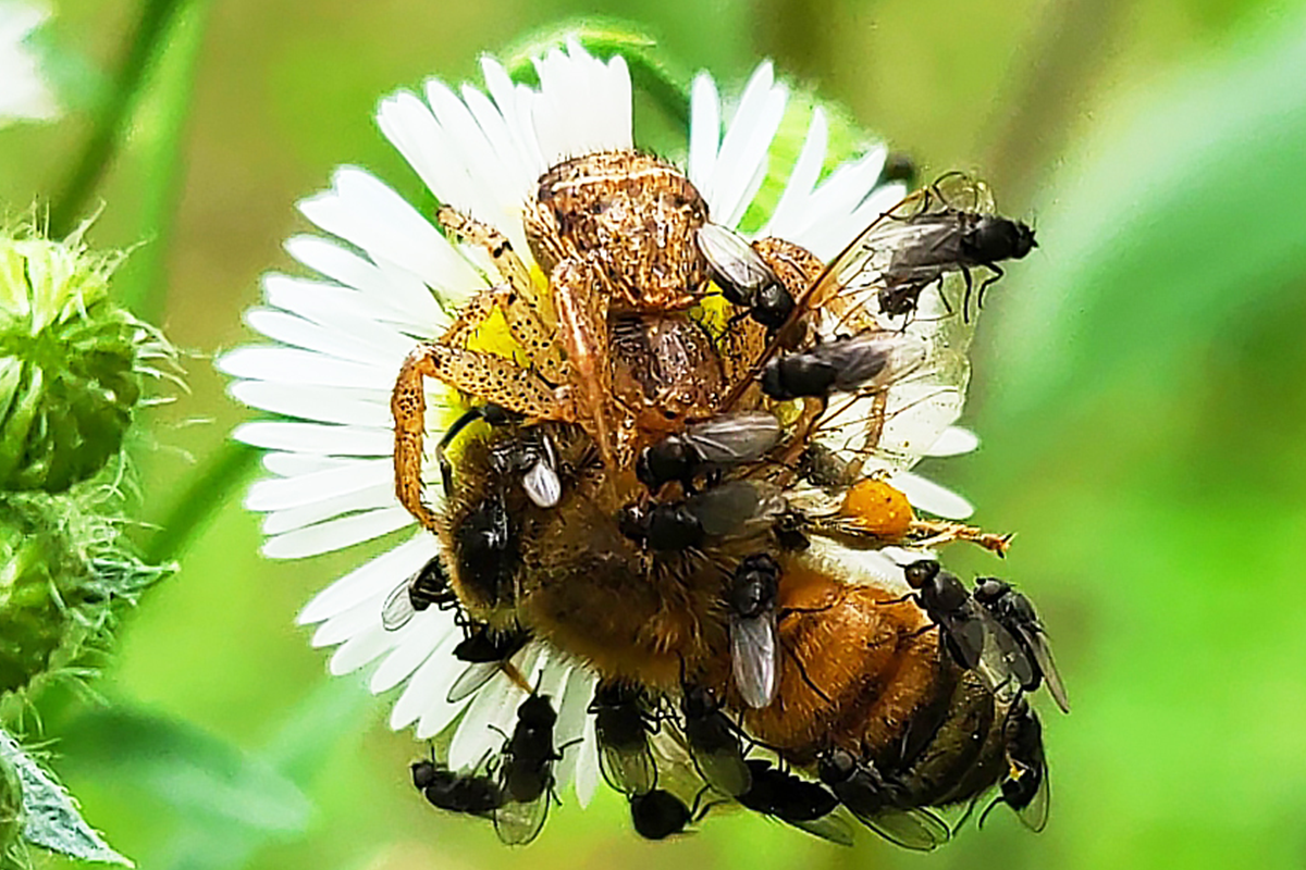 익히 알려진 대로 이들은 사냥당해 죽은 꿀벌 위를 돌아다니며 체액을 빨아먹고 있었습니다.