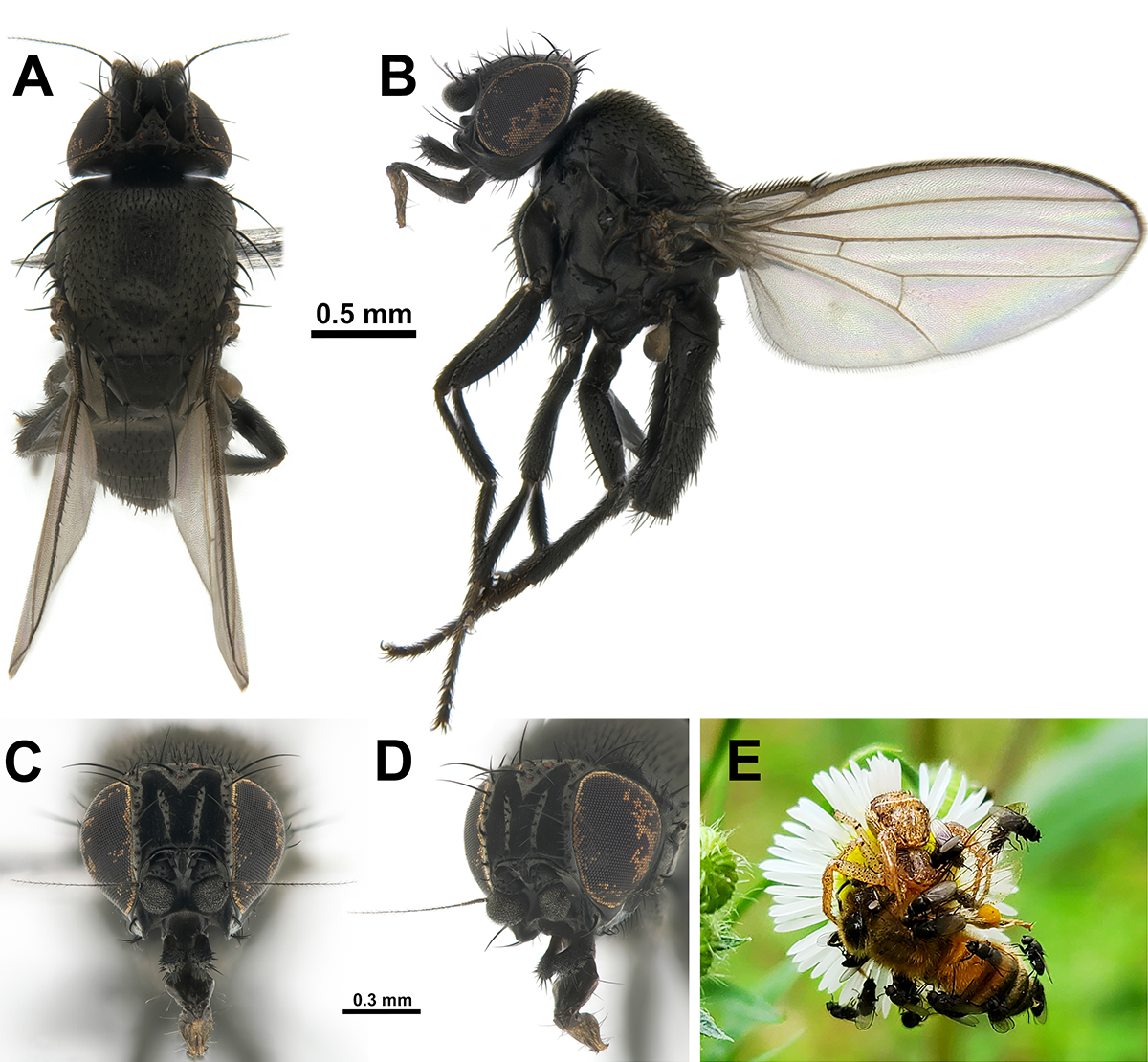 충청북도 증평의 한 꽃밭에서 거미가 잡아먹고 있는 꿀벌에 이 파리가 다수 앉아 있는 것이 관찰되었습니다(그림 1E).